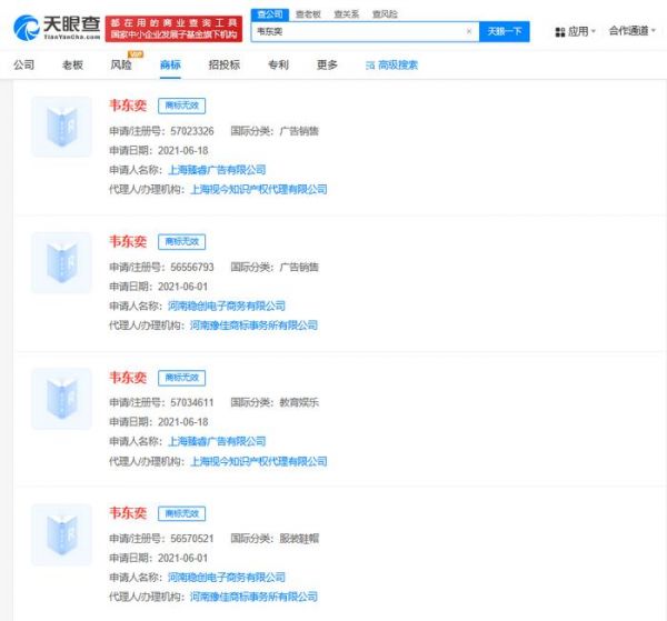 天眼查知识产权信息显示,“韦神”已被多方申请注册为商标,申请人包括广告、商贸、科技等公司及多名自然人,国际分类包括网站服务、教育娱乐、科学仪器等,其中部分商标已注册成功。此外,“韦东奕”也曾被两家公司申请注册为商标,国际分类包括教育娱乐、广告销售、服装鞋帽,不过,这些商标申请均被驳回,处于无效状态。