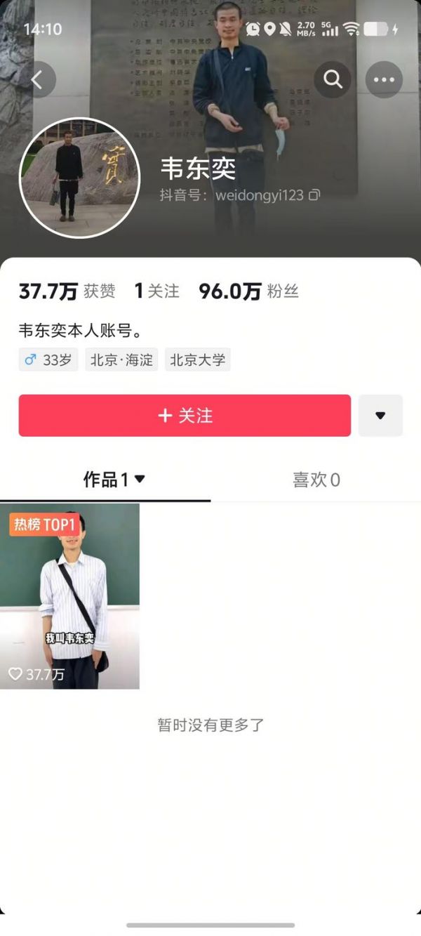 据媒体报道,6月6日,有网友在短视频平台发现一用户名为“韦东奕”的账号,疑似是韦东奕本人。这个账号在简介中称系“韦东奕本人账号”,相关话题引发关注。截止14点10分,视频平台显示,“韦东奕”账号粉丝数已达96万,视频已获得37.7万点赞。