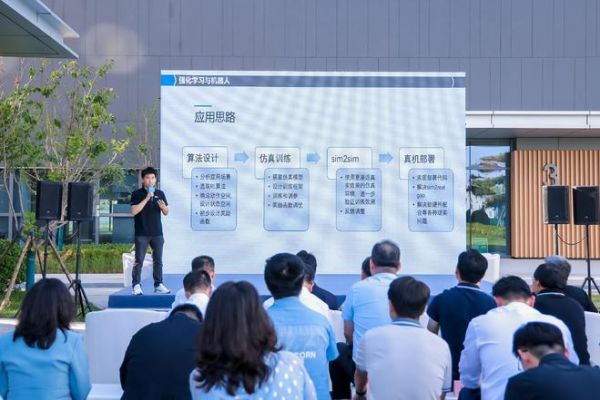 ▲松延动力“小顽童”在亦庄人形机器人半程马拉松比赛现场(图源:松延动力)姜哲源重点剖析了深度强化学习在机器人中的应用,其具体思路可分为四个部分,分别为算法设计、仿真训练、sim2sim(Simulation-to-Simulation)、真机部署。松延动力下半年的重要工作就是保障机器人交付。