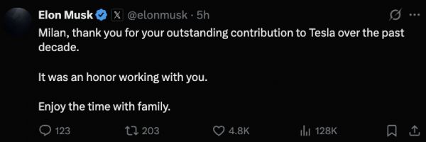也就在5天前的社媒上,马斯克还同时称赞他们两位是公司人工智能运营中的两个“关键人物”。