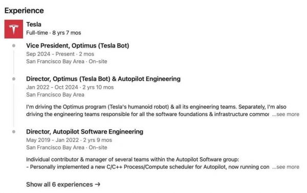 在他的离职信中,他首先回顾了自己在特斯拉的十年工作经历,包括连续几代Autopilot计算机和相关软件的迭代升级,以及Optimus成立伊始时的艰难。