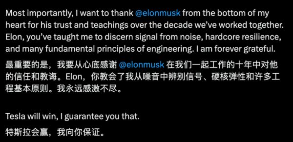 同时他也感谢了特斯拉的同事们,尤其是马斯克,盛赞他孜孜不倦的教诲,教会他从噪音中辨别信号、硬核弹性和许多工程基本原则。