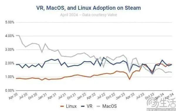 结果,Arcade 推出五年了,新增游戏还是休闲手游风,和玩家设想的“3A 大作”南辕北辙。2020-2024 年的四年里,Steam 的 MacOS 用户占比已经从 4% 一路下降到了不足 2%,比 Linux 端还低。