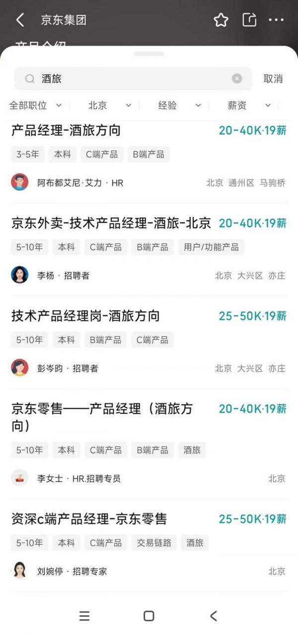 在BOSS上搜了搜,京东集团最近确实在大肆高新招聘酒旅方面人才,包括不限于技术岗、管理岗,看起来像是要在酒旅方面有大动作。