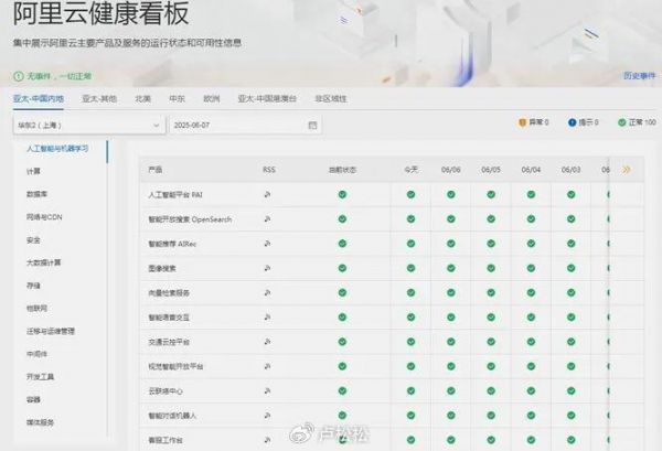 好在阿来云搞了个“健康看板”,哪个服务出问题了一眼就能查到。也算是透明沟通,官方通报的也及时。