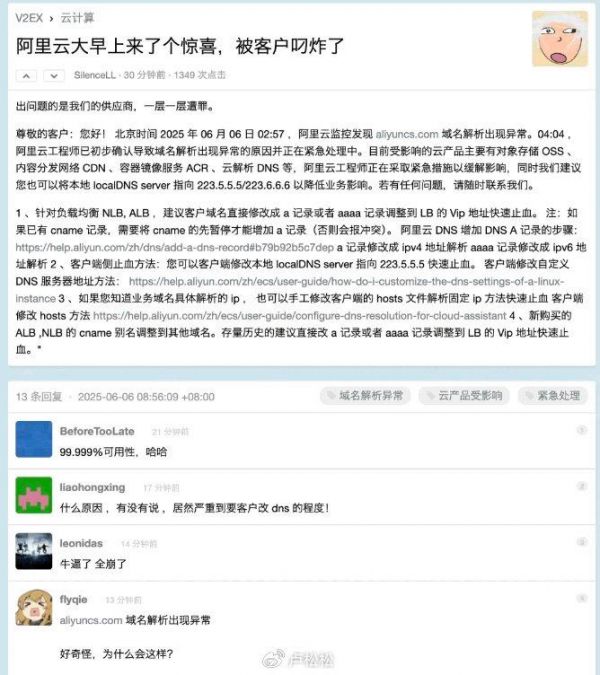 阿里云花了5个小时才解封,顺道做了个备用导航。像我们普通域名DNS更新需要24-48小时,而阿里云只用了5小时。但对不明真相的人来说,这5小时很长了。这事说大也不大,说小也不小,就看怎么理解了。由于发生在凌晨,用大量普通用户并无感知,但技术圈可炸锅了,知名的技术社区V2EX。