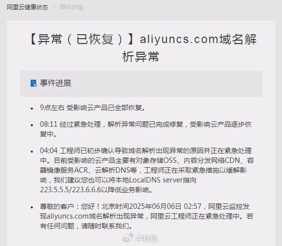 02:57出现故障 → 08:40完全恢复,阿里云只用 5小时43分就解决了。对比2014年根域名大瘫痪、早年百度域名劫持,阿里云的恢复速度已经算很快的了。