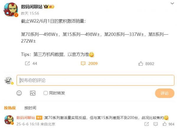 据博主透露的信息,截至今年6月1日,华为Mate70系列与小米15系列激活量均达到498万台,在国产旗舰销量榜上并列第一。