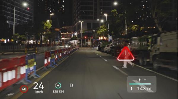 AR-HUD 可以清楚提示夜晚「鬼探头」物体|图片来源:华为HUAWEI XHUD AR 构图引擎采用自研轨迹预测算法时延补偿算法,能够根据车辆的行驶状态智能预测真实位置变化,并对显示的 AR 图标进行时延补偿。通过这套算法,AR-HUD 能在 200 毫秒内对车辆状态和外部物理世界的变化做出响应,使 AR-HUD 画面始终与物理世界精准贴合。
