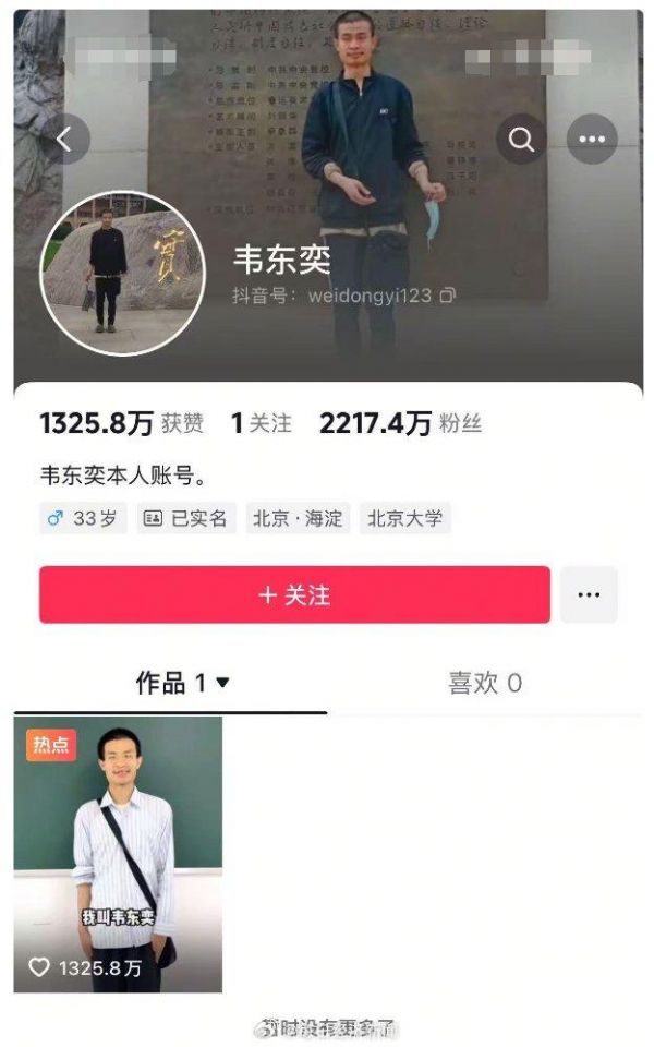 韦东奕一天涨粉1000万