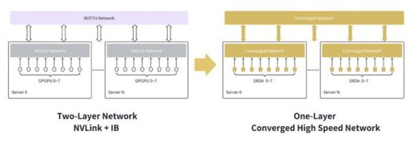 针对传统两层网络的痛点,SRDA 将节点内高速互联(Scale-up)和节点间通信网络(Scale-out)融合成统一的单层网络,显著简化网络拓扑,降低协议转换和管理开销,并能有效减少后端网络端口数量,从而降低部署成本和复杂度。