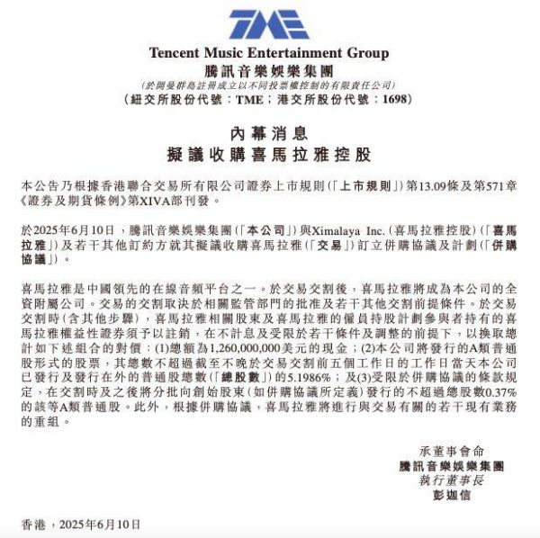 6月10日晚,腾讯音乐娱乐集团(以下简称:腾讯音乐)发公告称,与喜马拉雅签署并购协议,计划以现金12.6亿美元(约合90.6亿元)及腾讯音乐相关股权组合,全面收购喜马拉雅。