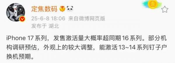 近日,博主定焦数码预测,iPhone 17系列的发售激活量大概率会超过去年同期的iPhone 16系列。