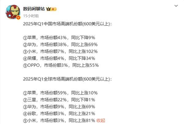 最新行业数据显示,2025年第一季度,中国高端手机市场格局发生巨变,苹果市场份额同比下降9%至43%,而华为与小米两大国产手机厂商分别以38%和7%的份额紧随其后,同比增长69%和102%。