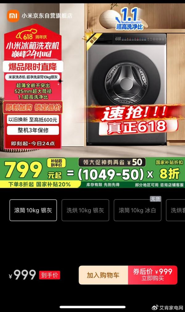 而且,这不是个例。小米一款10公斤滚筒洗衣机国补补贴后到手价799元起,10公斤洗烘一体机国补后1079元起。