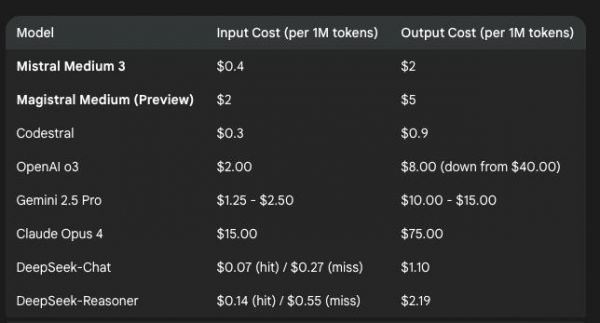 然而,与外部竞争对手相比,Magistral Medium 的定价策略却显得极具竞争力。它的输入成本比 OpenAI 最新型号便宜,与 Gemini 2.5 Pro 的价格处于同一水平,输出成本也远低于这两款产品。