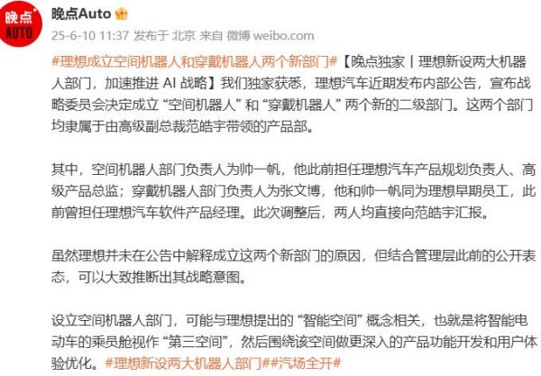 电动知家消息,6月10日,据晚点Auto报道,理想汽车近期宣布成立“空间机器人”和“穿戴机器人”两个新的二级部门,这两个部门均隶属于由高级副总裁范皓宇带领的产品部。这一举措是理想汽车在人工智能领域的重要布局,旨在进一步推动其在智能空间和穿戴设备领域的技术创新。