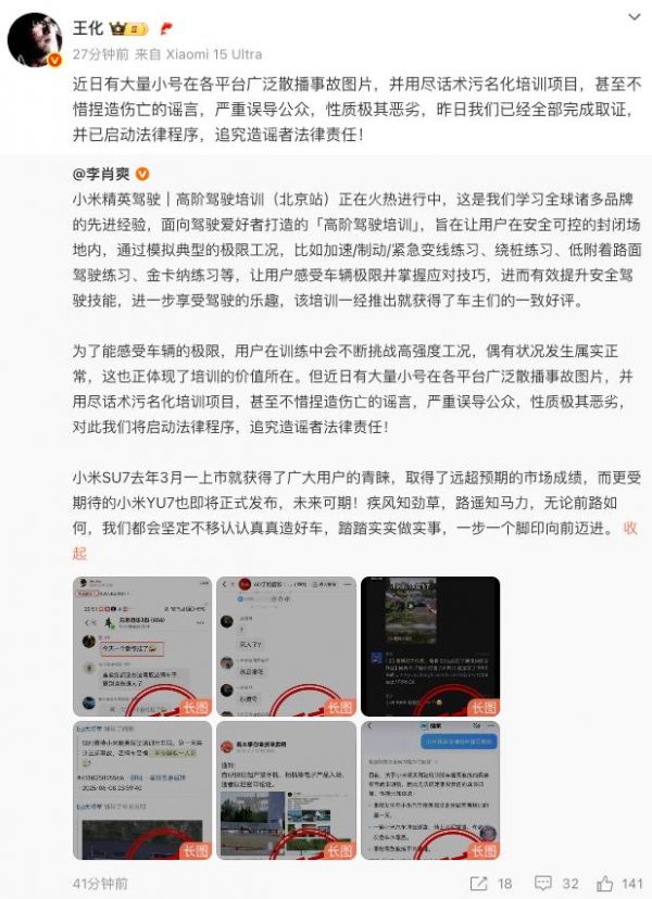 6月10日,针对网传小米汽车高阶驾驶培训出现致命车祸,小米汽车副总裁李肖爽在微博发文辟谣称,近日有大量小号在各平台广泛散播事故图片,并用尽话术污名化培训项目,甚至不惜捏造伤亡的谣言,严重误导公众,性质极其恶劣,对此小米汽车将启动法律程序,追究造谣者法律责任。随后,小米集团公关部总经理王化转发该条微博并表示,昨日已经全部完成取证,并已启动法律程序。