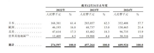 招股书显示,卧安科技产品主要面向海外市场,日本、欧洲、北美的销售额占比超过95%。其中,日本市场是最大销售来源。2022年、2023年及2024年,卧安机器人在该地区收入分别为1.68亿元、2.85亿元及3.52亿元,占总营收比重分别为61.4%、62.3%及57.7%。
