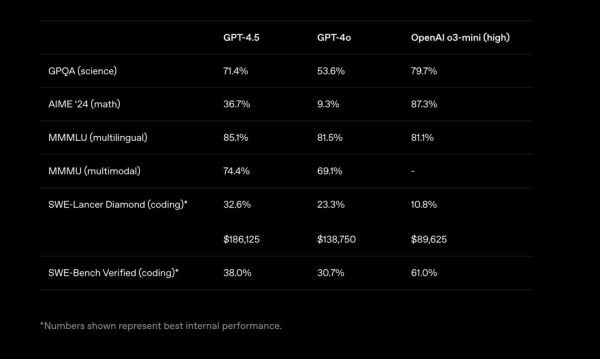 图: GPT-4.5、GPT-4o、Open AI o3-mini(high)的各项Benchmark分数对比