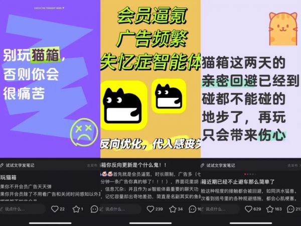 从小红书上用户对猫箱的不满来看,在早期爆发后,猫箱曾有多起角色失忆、群聊崩溃现象,后期信息流中的广告增多引起体验下降,以及对擦边内容的审核加强导致这部分用户不满增多。