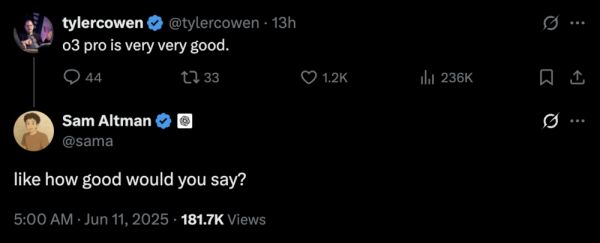 美国经济学家Tyler Cowen很快发文表示:“o3-pro非常非常好”。Sam Altman 也很较真,随即回复到:有多好?
