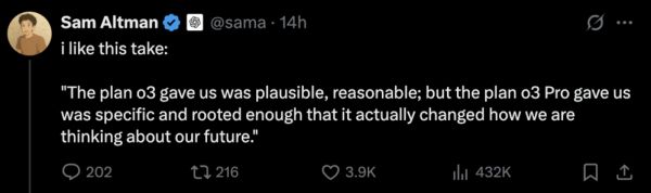 “o3 给我们的计划是可行的、合理的;但 o3-pro 给我们的计划是具体的、足够根深蒂固的,它实际上改变了我们对未来的看法。” Ben表示。
