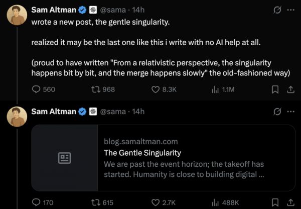 6月10日晚,Sam Altman 首先在X上宣布了o3模型降价80%,并暗戳戳预告了o3-pro版本的性价比。模型发布的同时,他写下了题为《温和的奇点》的文章。并表示,这可能是他最后一篇完全没有AI帮助的文章了。