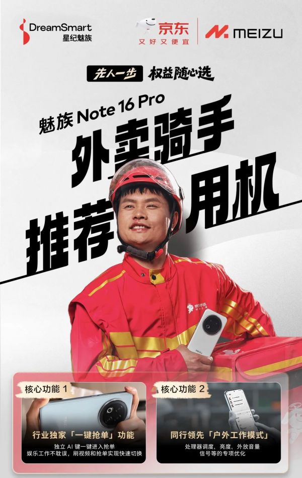 拿今年5月发布的魅族 Note 16 系列手机来说,作为“京东外卖全职骑手的推荐用机”,其一亮相就吸引了大众目光。作为京东和魅族深度共建的重点新品,叠加国补后,魅族Note 16系列最低594.15元起,对骑手极具性价比。而且,很多骑手还通过“京补合约”下单,最低102.52元就可以入手,还拥有了新的手机号卡,获得了通用大流量和通话套餐,满足他们的日常电话需求。
