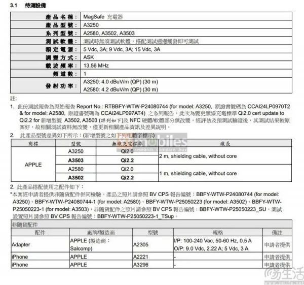 与现有型号(A2580和A3250)相比,新的MagSafe充电器型号为A3502和A3503,分别对应1米和2米线长的两种版本。它们与目前代次最为显著的改变,就是将无线充电标准从现有的Qi 2.0升级到了新的Qi 2.2版本。