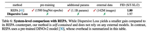 在SiT-XL/2 模型上,Dispersive Loss的FID为1.97,而REPA的FID为1.80。