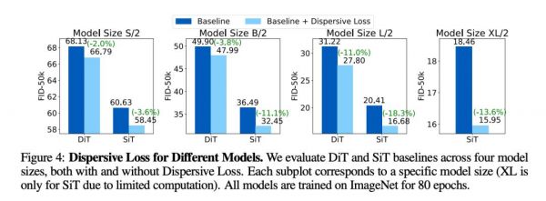 作者在ImageNet上,使用DiT和SiT作为基线模型,对不同规模的模型进行了广泛测试。