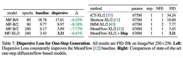 另外,无论是多步扩散模型还是单步生成模型,都能基于Dispersive Loss得到明显改进。