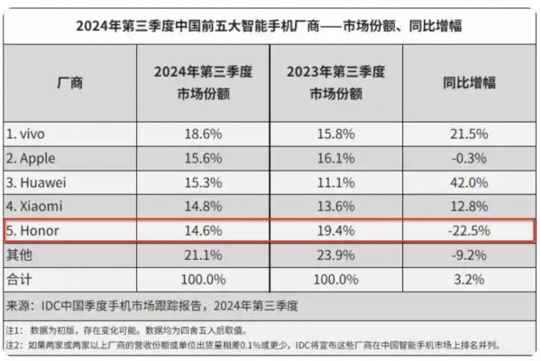 第三季度和第三季度,荣耀出货量分别出现了高达 22.5% 和 14.9% 的同比下滑,排名在国内第五名和第四名——2024 年全年,国内智能手机大盘提升了 5.6%,而荣耀出货量同比下滑 8.1%。