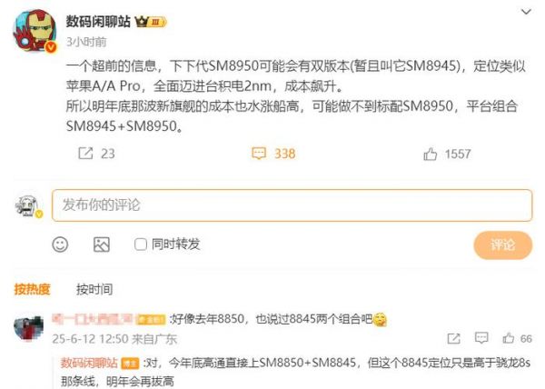 也就是除顶级的SM8950外,另推一款型号为SM8945的芯片,构成“至尊版”与“标准版”的组合拳。