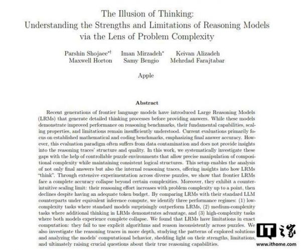 IT之家 6 月 14 日消息,科技媒体 9to5Mac 昨日(6 月 13 日)发布博文,报道称苹果公司 6 月 6 日发布的 AI 研究论文《The Illusion of Thinking》引发争议,专家质疑评估方法。