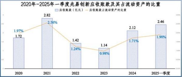 2020年-2025年一季度,兆易创新应收账款基本保持在2亿元上下,并且其应收账款占流动资产的比例仅有2%。