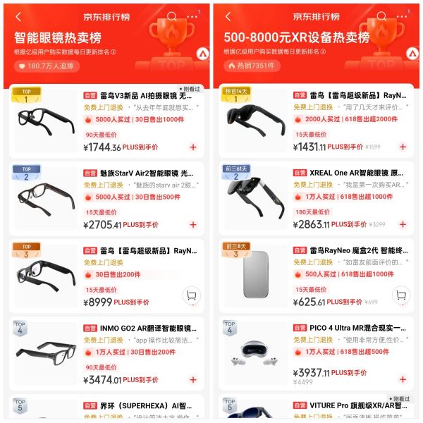 另外从电商数据来看,目前国内 AI 眼镜中卖得最好雷鸟 V3,30 日销量也才达到 1000 件,相比不温不火的 XR 设备(以 AR 眼镜为主)也还有一定差距。