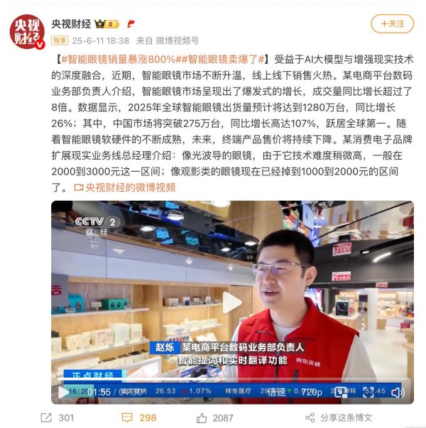 今年以来,AI 眼镜在传播层面已经火过了好几次,甚至在一定程度上实现了破圈,包括在销量层面也有可观的表现。在央视近期播出的节目中,京东数码业务部负责人在接受采访时就透露,近期(AI)智能眼镜的成交量同比增长超过 8 倍。
