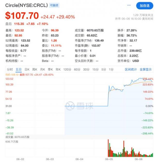 美东时间6月5日,“稳定币第一股”Circle正式登陆纽交所,其IPO发行价为每股31美元,上市首日经历两次熔断后涨幅一度超2倍,盘中股价最高超过103美元,截至收盘,Circle涨168.5%。
