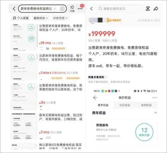 有人则是在闲鱼和小红书等平台上,出售“蔚来免费换电权益过户”,据说这种交易可以获利数万元不等。