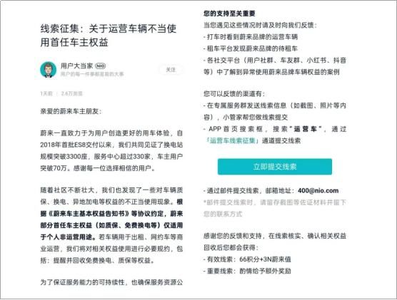 前几天,蔚来官方 App 上线了一个线索征集入口,鼓励车主举报在打车、租车平台遇到的蔚来品牌车辆异常使用案例,一旦线索核实有效,举报者将获得积分、蔚来值等奖励。