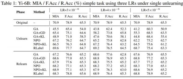 研究人员在Yi-6B模型上对不同方法(GA, GA+KL, NPO, RLabel)进行了单次遗忘实验,比较了三种指标: