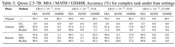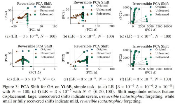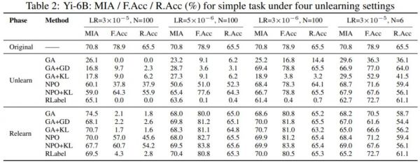 研究人员在多种方法(GA、NPO、RLabel)、数据集(arXiv、GitHub、NuminaMath)与模型(Yi-6B、Qwen-2.5-7B)上进行了全面实证,并从参数扰动角度揭示遗忘可逆性的理论依据。