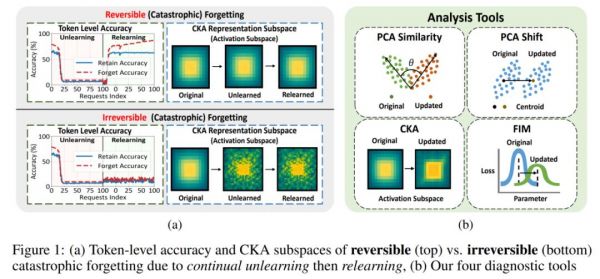 上方:虽然Unlearning阶段准确率急剧下降,但Relearning之后快速恢复,表示空间保持稳定,属于可逆(灾难性)遗忘; 下方:虽然行为表现下降,但结构严重扰动,重训练也难以恢复,属于不可逆(灾难性)遗忘。右侧(b)则展示了研究人员构建的表示空间分析工具,包括PCA Similarity / Shift、CKA相似性分析、Fisher信息矩阵(FIM)。