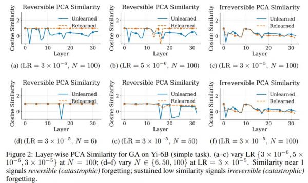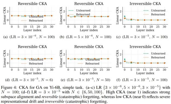可以发现,对于可逆性遗忘,其表示空间在Relearning后高度恢复原始主方向,而不可逆性遗忘则呈现广泛漂移: