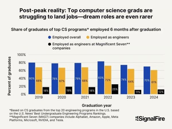 我特别注意到,即使是那些来自顶尖计算机科学项目的毕业生也无法避免这种困境。过去,一个来自斯坦福、MIT 或卡内基梅隆的计算机科学学位几乎就是进入硅谷大厂的保证,但现在即使是这些精英毕业生也在努力突破科技行业的壁垒。自 2022 年以来,在“七巨头”(Alphabet、Amazon、Apple、Meta、Microsoft、NVIDIA 和 Tesla)找到工作的新毕业生比例已经下降了一半以上。这不仅仅是一个招聘放缓的问题,而是对人才期望的根本性转变。
