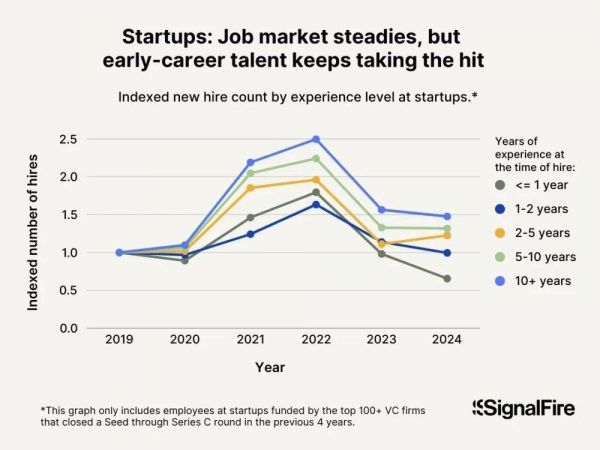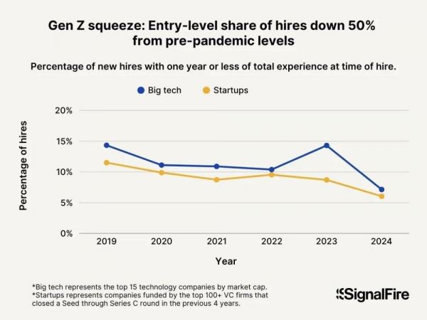 我在分析这些数据时,最让我感到担忧的是新毕业生面临的严峻现实。数据显示,大型科技公司现在只有 7% 的新招聘是应届毕业生,与 2023 年相比下降了 25%,与疫情前的 2019 年相比更是下降了超过 50%。初创公司的情况也好不到哪里去,新毕业生仅占招聘的 6%,相比疫情前下降了 30% 以上。这种下降不是暂时的调整,而是结构性的转变。