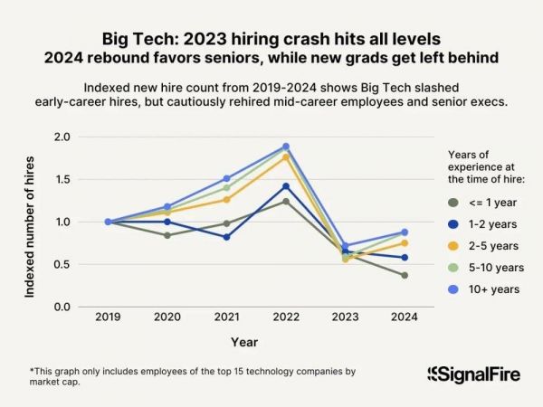 你有没有想过,计算机科学专业可能不再是通往科技行业的黄金门票了?曾经,科技公司对应届毕业生张开怀抱,现在这扇门却在逐渐关闭。过去几年里,我们目睹了一个令人震惊的现象:尽管科技行业整体上仍在增长,但新毕业生的就业机会却在大幅萎缩。根据 SignalFire 最新发布的 2025 年人才报告,与疫情前相比,科技行业对新毕业生的招聘已经下降了 50%。这不是简单的经济周期调整,而是整个行业正在经历的根本性转变。