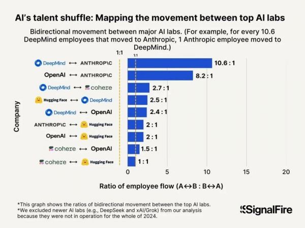 我深入分析了 Anthropic 成功的原因,发现他们的优势不仅仅在于保留人才,更在于吸引人才的精准策略。数据显示,工程师从 OpenAI 跳槽到 Anthropic 的可能性是反向流动的 8 倍。从 DeepMind 流向 Anthropic 的比例更是达到了近 11:1。虽然这部分原因是 Anthropic 作为热门新创公司的吸引力,以及 DeepMind 更大、更资深的团队天然存在人员流动,但这种流动规模的差异仍然令人震惊。